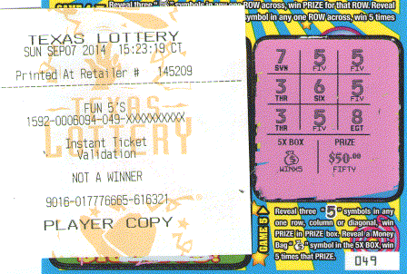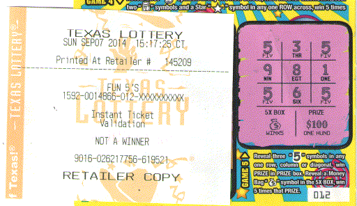 Dear Sir or Madam: I bought Texas Lottery's Fun 5s scratch off tickets from my local lottery retailer. Game 5 on this scratch ticket reads as follows: Reveal three 5 symbols in any one row, column or diagonal win PRIZE in PRIZE box. Reveal a Money Bag symbol in the 5X BOX, win 5 times that PRIZE. Please notice that all games use the word "that" except game #1 The official and contradictory game rule posted in the Texas Register dated June 20, 2014, under 2.0 Determination of Prize Winners, reads GAME 5: "If a player reveals three "5" Play Symbols in any one row, column or diagonal, the player wins the PRIZE in the PRIZE box. If a player reveals a "MONEY BAG Play Symbol in the 5X BOX, the player wins 5 times that PRIZE."Again, please notice that all games use the word "that" except game #1 However, confusing & conflicting language under, 2.2 Programmed Game Parameters. GENERAL: Game 5; U. It reads, "As dictated by the prize structure, the "MONEY BAG" Play Symbol "will" appear in the 5X BOX when the player has won by getting three (3) "5" Play Symbols in a single row, column, or diagonal line." In the above language, "WILL" indicates this is mandatory; not discretionary. Yet the two parables; having the three (3) 5's "and" the 5X Money Bag, is not consistent with written word instruction printed on the ticket; nor is it consistent with 2.0 Determination of Prize winners. Please note, the Fun 5's ticket below contains three (3) 5's in a row but there is NO Money Bag. Why doesn't this ticket have a Money Bag on it like the rule says?