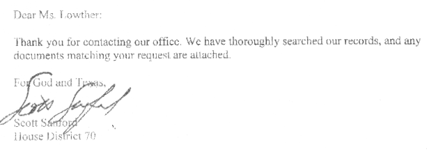 Under "status" on Lowther's contact profile report, Sanfords office checked, "closed." I would recommend that this player [Lowther] file a complaint with the Open Records division of the AG's office. Maybe then she could obtain all documents responsive to her original request. So for you players that told me you wrote to Representative Sanford, apparently they/he did not receive your letters. And if any of you want to know what your State Rep's and Senators received, you can make the same request Ms. Lowther made to her elected official. You might be surprised at what you will learn by seeing these documents! If you do this, be sure to tell them that they "may redact personal information."