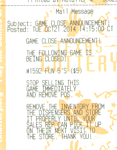 As you see, they told 17,000 retailers to stop selling this ticket immediately. My guess is that most likely 16,500 retailers did NOT check their mail so they did not get the message. Then, to add insult to injury, there are many, many retailers who will wait on their G-Tech reps to come and remove tickets - the retailers will NOT remove the tickets themselves. Many retailers have made it clear that they have too many other concerns and can't and/or won't keep track of all of the lottery products. This is why the tickets were/are still selling even though the game has been issued a "close date." Close date means the tickets can be sold for 45 days after the date has been set. Just so that you know - to protect players, I have tried for years to reduce that 45 day period. (See page 12, Issue 11 in my last Sunset recommendations.pdf) But the Texas Lottery has always objected stating that G-Tech needs the full 45 days to pick up all tickets. I think it's a bunch of baloney since G-Tech reps are required to be in every store at least once every two weeks. The "45-day" motive .... so the lottery can continue to sell tickets with NO top prizes left in the game which is really a tacky thing to do. Speaking of tacky ... I witnessed a G-Tech rep picking up a $50 game on the very day a close date was announced. The store owner objected ... he wanted to keep the ticket because it was a hot seller for him and he actually made money by selling $50 tickets. But his rep took the tickets out of his store anyway. Why do you think they wanted those tickets picked up? My guess, common sense and logic says it was because there were still two top prizes left unclaimed. Hmmm. ... Once I suggested that a rep remove a game with no top prizes but he refused stating there were still plenty of low tier prizes. This encounter took place roughly 30 days after the close date had been announced. Point here - they leave tickets in the stores when it's to their financial advantage and pick them up ASAP when it's to their advantage too. This is WRONG. Now, this time, as fate would have it ... <grin> What's really interesting is what store clerks are telling players about the game being closed. They are saying that either all top prizes have been sold or there was a printing error. Hearing this really caught me by surprise. As I write this, only 3 of the 16 top prizes have been claimed and as we all know, there are no "printing" errors either. Obviously there is an error - but "printing" error??? If that had been the case, they would have closed the game much sooner. Huh? Gregg Abbott rejected all Fun5 complaints ... Let's reason ... the TLC says they owe you nothing .... the Consumer Protection Division in the Texas Attorney Generals office refuses to assist you .... then you're told that you cannot sue the Texas Lottery. What recourse do lottery players (consumers) have in Texas? This is precisely what we need our elected officials to tell us and this is what we are waiting for now. An answer to this very question. Just so that you know ... My recommendation fell upon deaf ears by Members of the Texas Legislature - legislators said they didn't need to write it into law because the Texas Lottery said they would voluntarily comply to truth in advertising and deceptive business laws. Hmmm ... so much for that ... Huh? Now is test time - Members - are you going to intervene? If not, then we (many Texans) may need permission to sue the Texas Lottery. Of course, we do need to verify that the lottery is the right entity to sue which is what my petition is all about. Court hearing ... I will be there but I doubt anyone else will be except the attorneys. I don't even know if the Judge will give us an answer on that day. The Court is a public place so anyone can go if they choose to go. But I don't think this is the case you would want to see. If the Texas Legislature does not instruct the Texas Lottery to pay my prize - then I can assure you I will do everything in my power to TRY to collect my winnings. As will you - I'm sure. Those trials would be the ones you would want to attend. For the first time, you would you be able to get a first hand look at the things the Texas Lottery has gotten away with in years past. They have a history of "interpretation" issues, confusing "rules" with "policies and procedures," keeping players prize money, stalling payments in disputed claims and neglecting critical job duties that protects state money (ie ... failed to balance check book resulting in people stealing money from the lottery - better known as fraud - and those people got away with it because the Texas Lottery didn't catch the fraud for 2 years - the banks give customers 90 days to catch unauthorized activity) Sad but VERY true. As a results of all my lottery work in the past 15 years, I promised myself that IF I was ever a winner, I would not let the Texas Lottery screw me out of my winnings. It appears my day may finally be here. What do I think or know is going on .... So far, we have seen the game closed. I have been watching the tickets being picked up and I've seen some aggressive actions by G-Tech reps in picking up the tickets. Many of you have reported the same thing to me so I feel confident that the majority of the tickets should be out of the stores this week. Now G-Tech will tally what was sold and what was cashed in and what remains to be cashed in. Players have 180 days to collect prizes on this game. Next they'll count how many of the tickets that were sold had the money bags in Game 5 and how many of the tickets had three 5's in a row in Game 5. After they arrive at these initial figures - they will then compute how many tickets were trashed or cashed in because other games on the tickets were winners. This will reduce the liability figure. But then they will have to compute how many tickets may have been retrieved from the trash by players and store clerks. The reason the store clerks role is so important in this